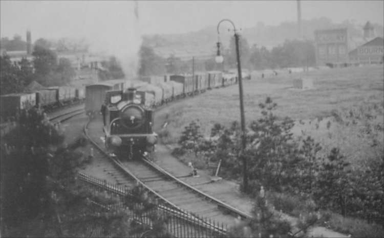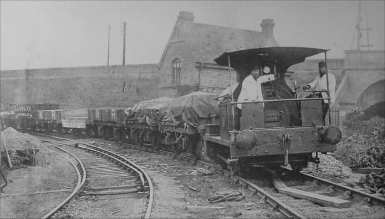 This open cab locomotive was the first to be delivered to the Cadbury factory at Bournville . This photograph was probably taken in the late 1880's and it is interesting to note that as well as two wagons with Midland Railway markings there is also one marked up as 'Cadbury Bournville.