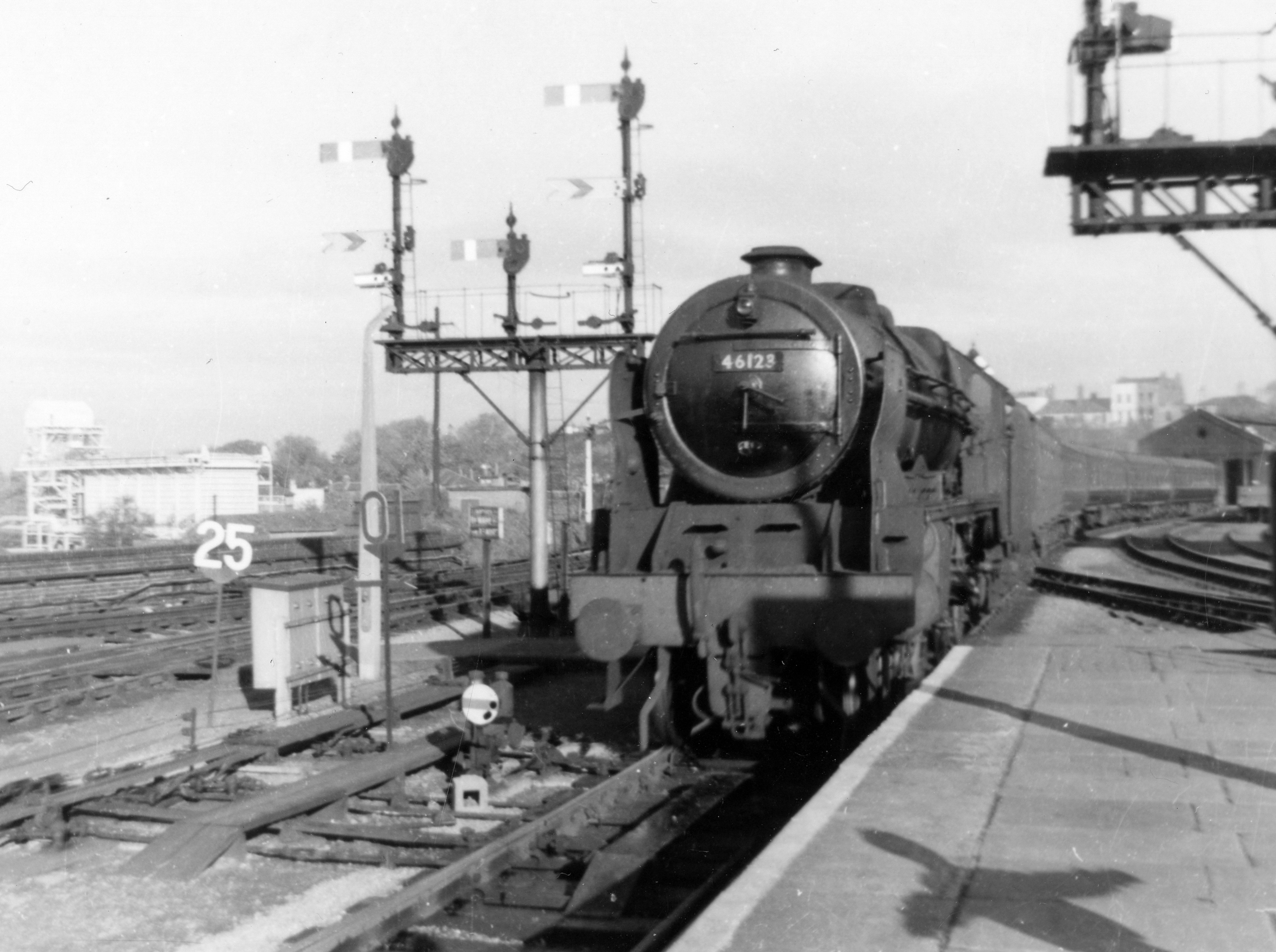 "Royal Scot" class 7P 4-6-0 steam locomotive No.46123 "Royal Irish Fusilier" comes off the Bromsgrove line and into Worcester Shrub Hill Station with what was is probably a Birmingham to Bristol local train. The locomotive carries a 21A shedplate indicating that this photograph was taken in 1962 during the short period that the locomotive was allocated to the Birmingham shed.