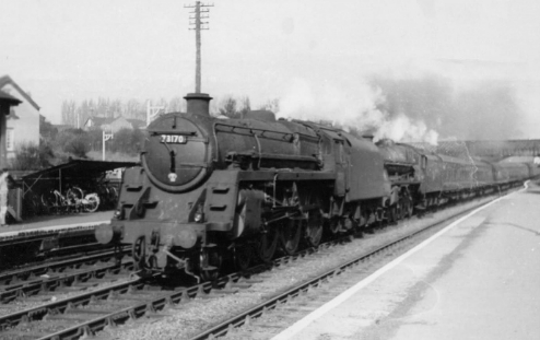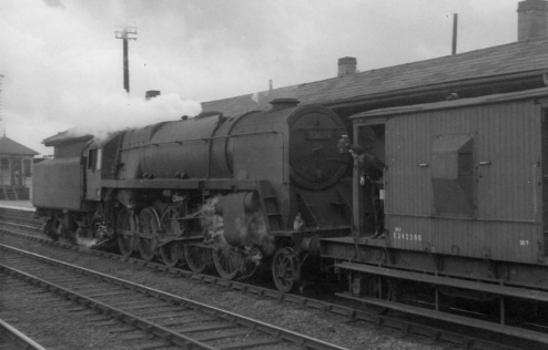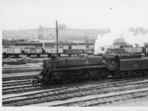 This page contains ten photographs of BR Standard class locomotives at work in the county in the early 1960s. The first three are class 5 4-6-0 mixed traffic locomotives and the other seven are BR Standard class 9F 2-10-0 locomotives in Bromsgrove and Barnt Green.