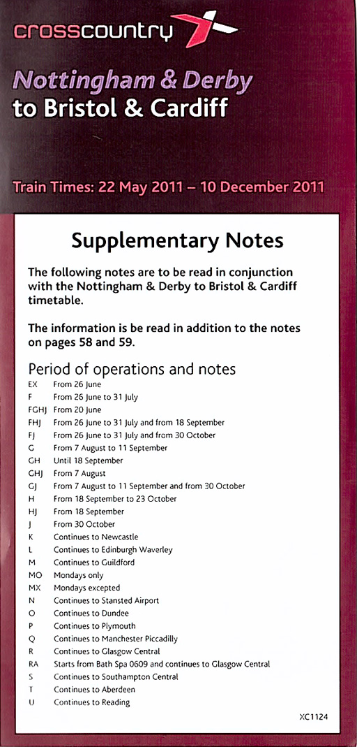 This is Cross Country Trains nicely designed timetable for the services from Nottingham & Derby to Bristol & Cardiff. Sadly the whole thing is badly let down by a lack of attention at proof-checking stage leading to the necessity to produce an amendment sheet (right). The map is nicely drawn and reproduces well.