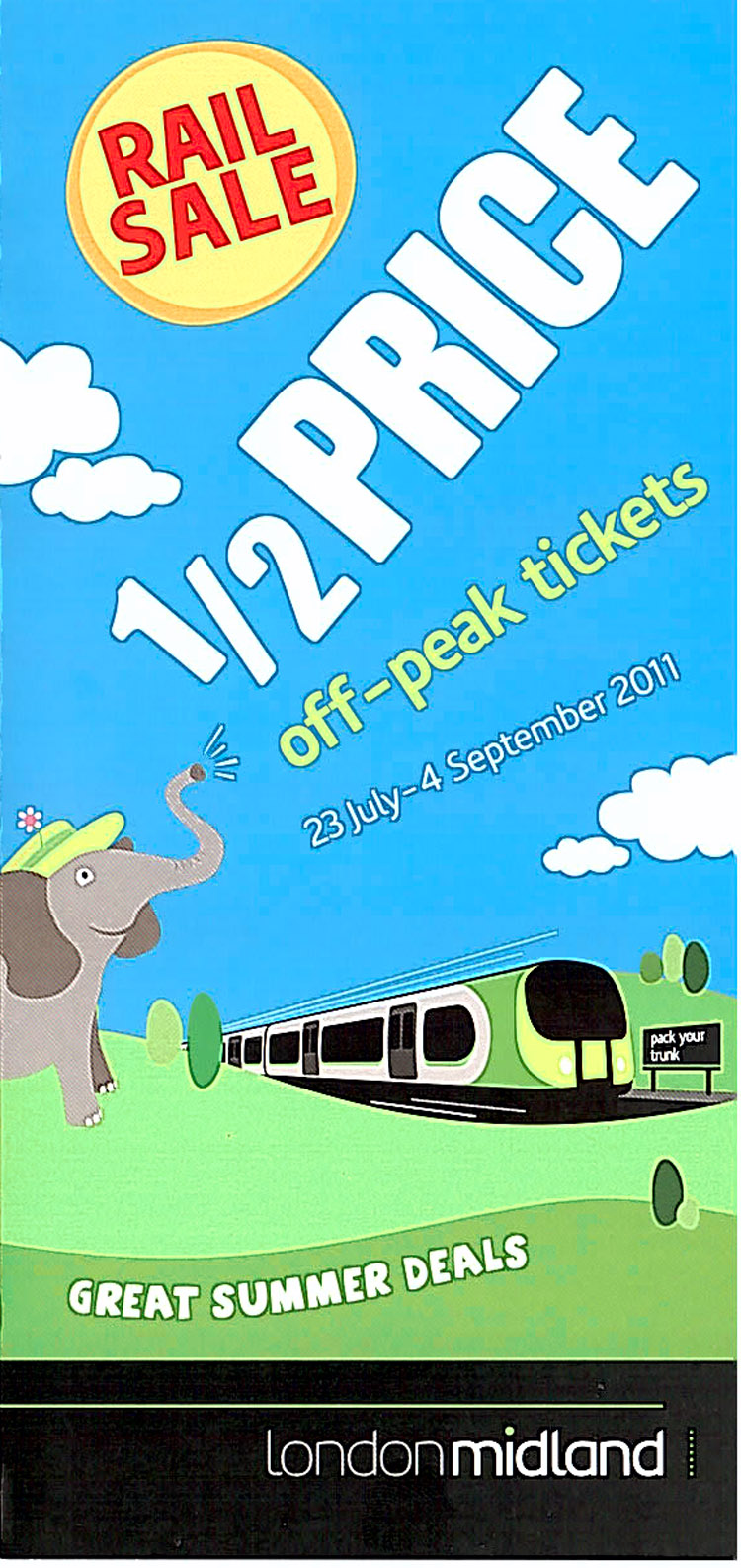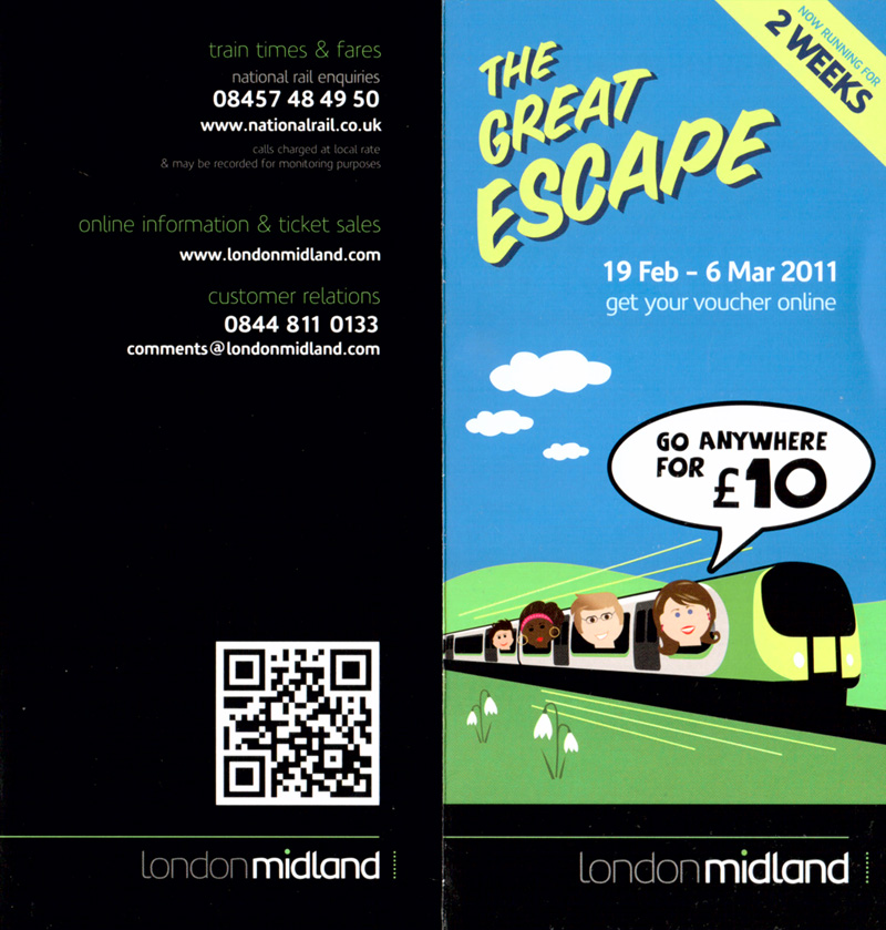 For two weeks during the half-term break (from 19th February to 6th March 2011) London Midland promoted its "Go Anywhere for £10" offer with this attractive leaflet. The offer was only available on-line. The weird graphic on the left hand side could be used with mobile phones to load the London Midland web page. The train made another appearance during a half-price ticket sale at Easter 2011 when it was seen in the platform at 'Easter Treats' Station.