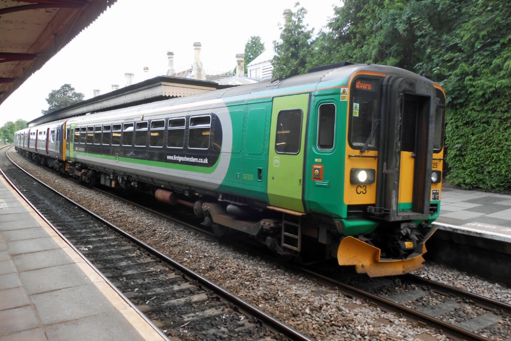 On Thursday 8th August 2013 the 18:50 First Great Western service (train code No.2T97) from Great Malvern to Bristol Temple Meads was made up of class 153 railcar No.153325, still painted London Midland livery, and hybrid three-car class 150/9 diesel multiple unit No.150927 consisting of both parts of class 150/0 No.150127 and car No.57209 from 150/2 set No.150209. All four cars had previously been used on Centro sponsored services in the West Midlands.