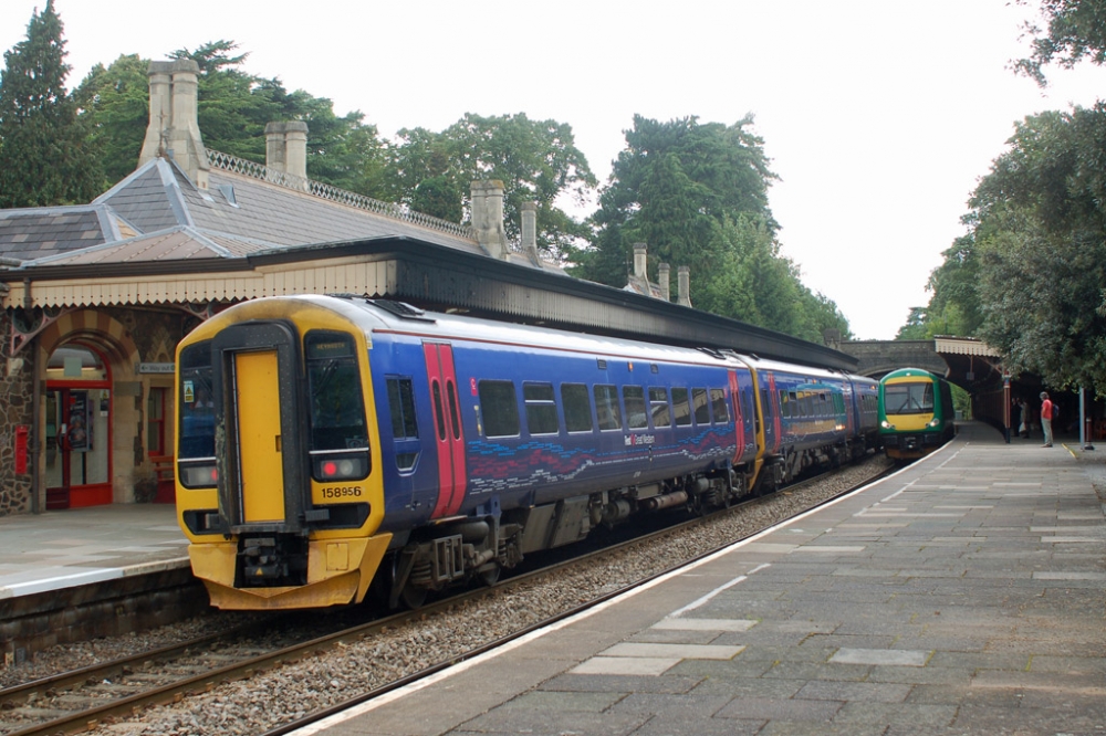 This hybrid class 158 three-car diesel multiple unit consisted of car No.52748 (from No.158748) and all of No.158768. This unit had arrived from Brighton and after reversal formed the 14:51 from Great Malvern to Weymouth. At the 'Down' platform is two-car London Midland livery diesel multiple unit No.170512 (No.50512 is leading) with the 13:49 from Birmingham New Street to Hereford. Photograph taken by Andrew Smith on 19th August 2010.