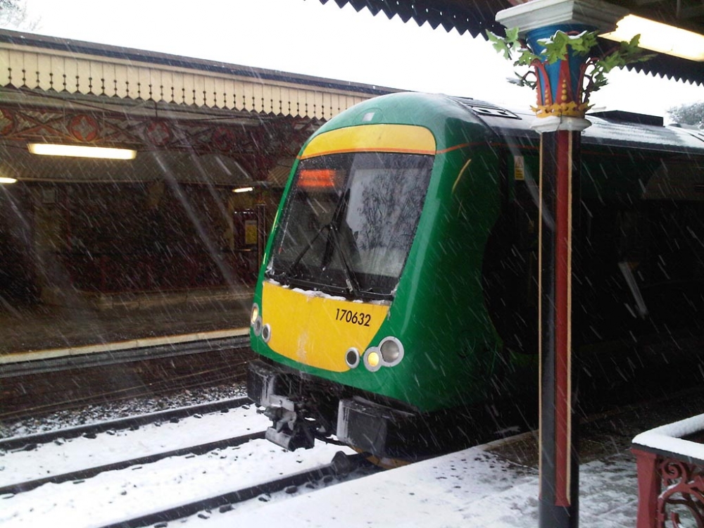 Also on 20th December 2010 London Midland class 170 diesel multiple unit No.170632 faces up to blizzard conditions as it waits to depart from Great Malvern with the late running 13:41 Hereford to Birmingham New Street service. The train had been re-scheduled to terminate at Droitwich Spa due to snow problems at Bromsgrove. Photograph by Andrew Smith.