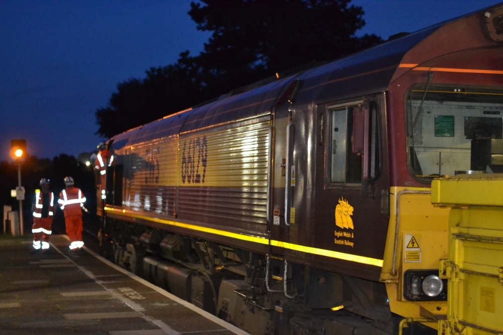 This interesting late night photograph was taken by Andrew Smith on 18th June 2016 and shows EWS livery class 66 diesel locomotive No.66128 with a ballast train from Bescot to Malvern in connection with the relaying of track at Malvern Wells. The engineering possession started just beyond the 'up' platform and the photograph shows the staff being briefed before the train was allowed into the section.