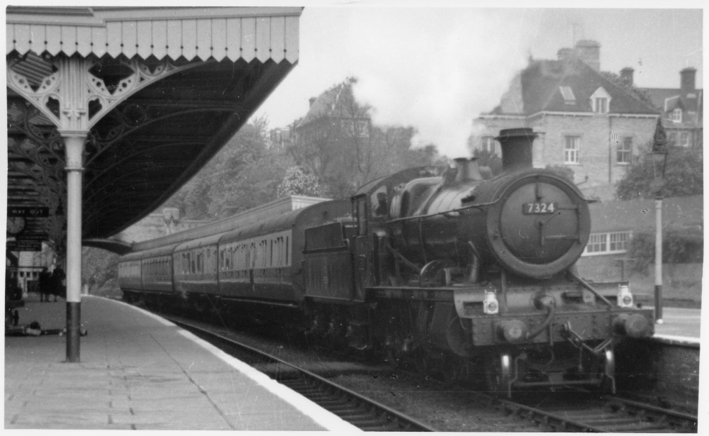 This photograph of Churchward-designed "4300 class" 2-6-0 mixed traffic steam locomotive No.7324 arriving at Great Malvern Station about 1958 is a particularly interesting one as on the right-hand side of the photograph the 'down' bay platforms can be seen. At this time they were used mostly for the "Pigeon Specials" which arrived from the Black Country with homing pigeons which were then unloaded onto the platform and released by a porter. When it was built this locomotive carried No.9302 but had been renumbered shortly before Tim Farebrother took the photograph. Earlier locomotives of this class were built without side windows. The locomotive was allocated to Olk Oak Common Shed and so had presumably been borrowed for this local working.