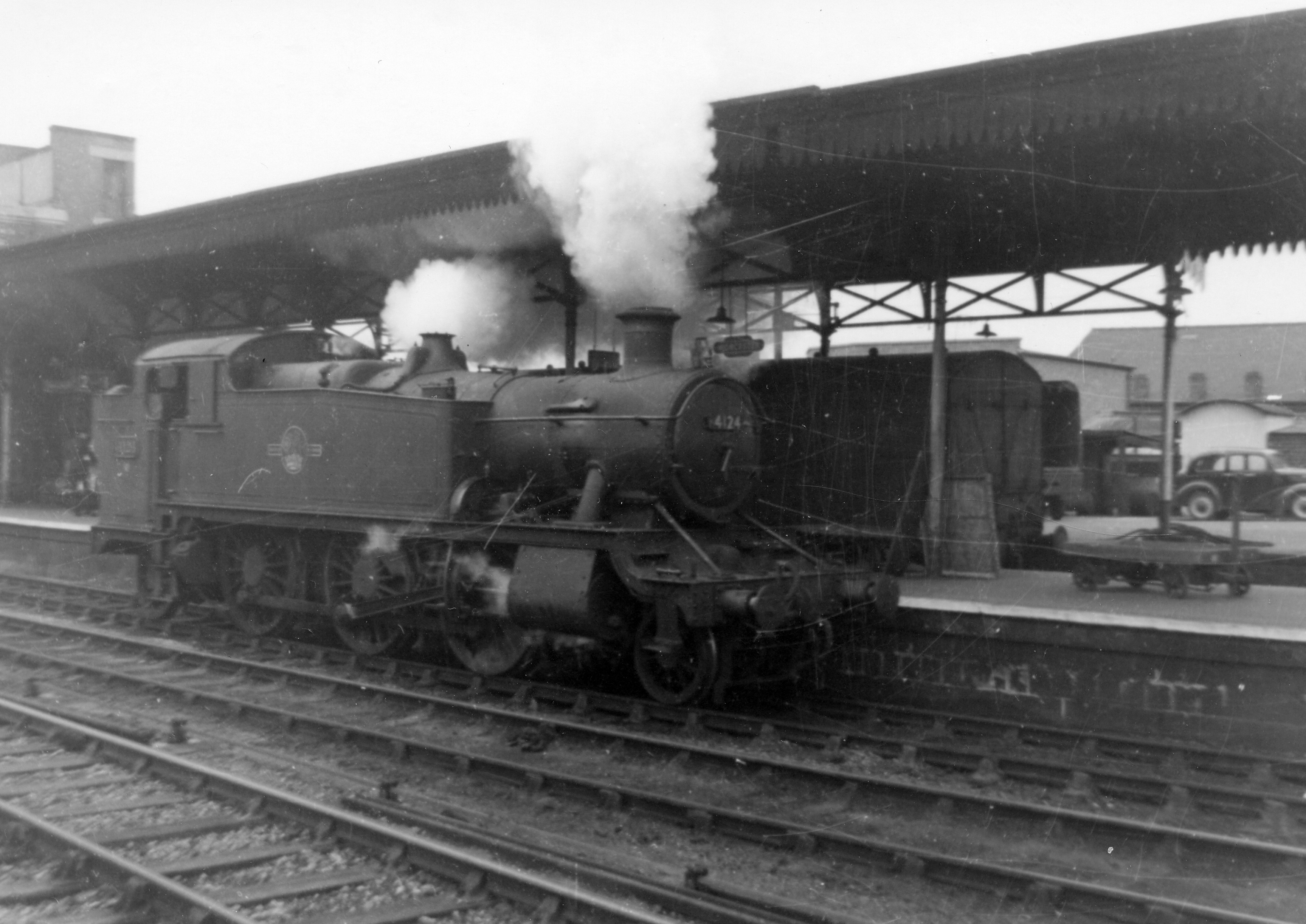 5100 class 2-6-2 tank engine No.4124 in platform 1 at Worcester Shrub Hill Station. Notice the parcels van in the bay platform.