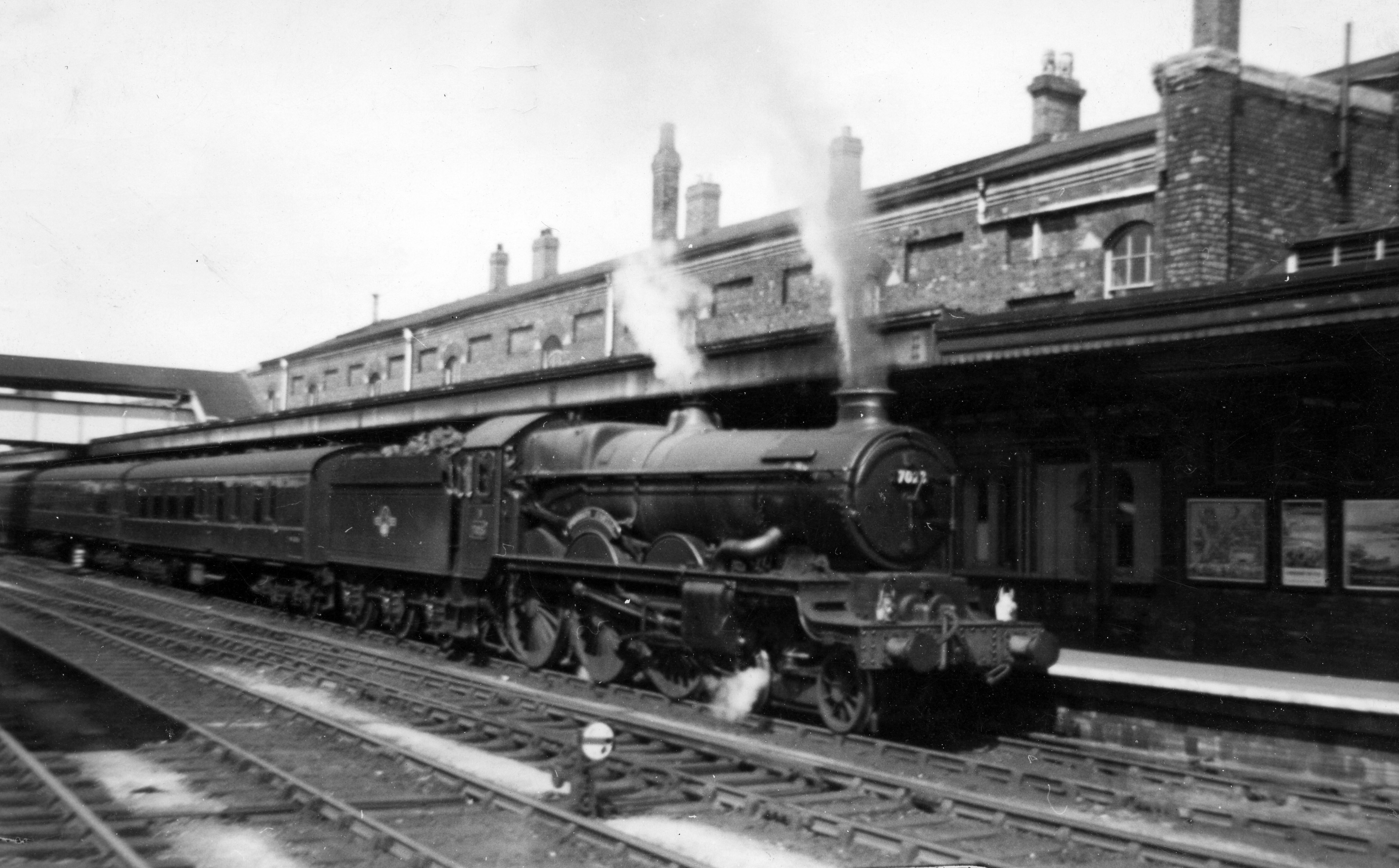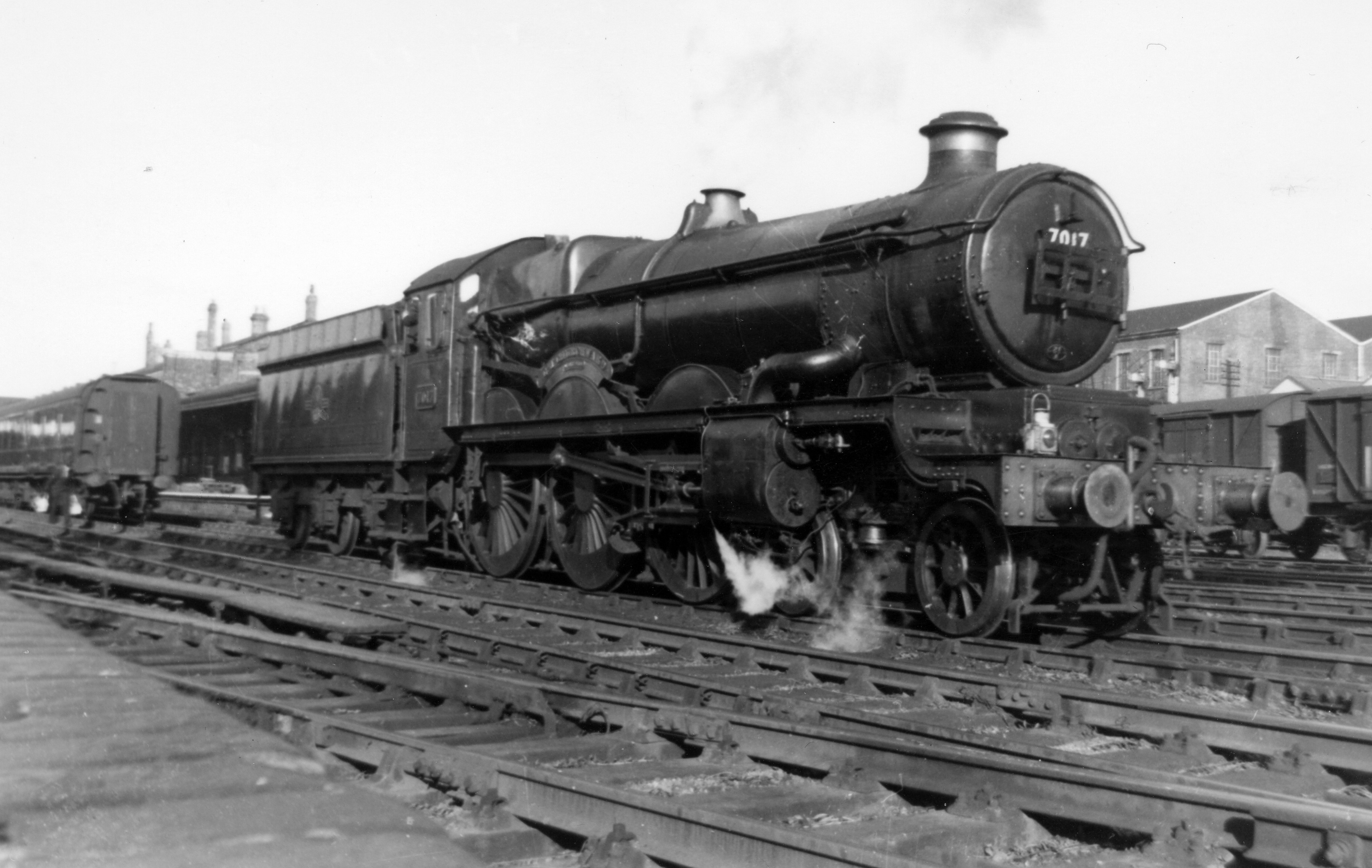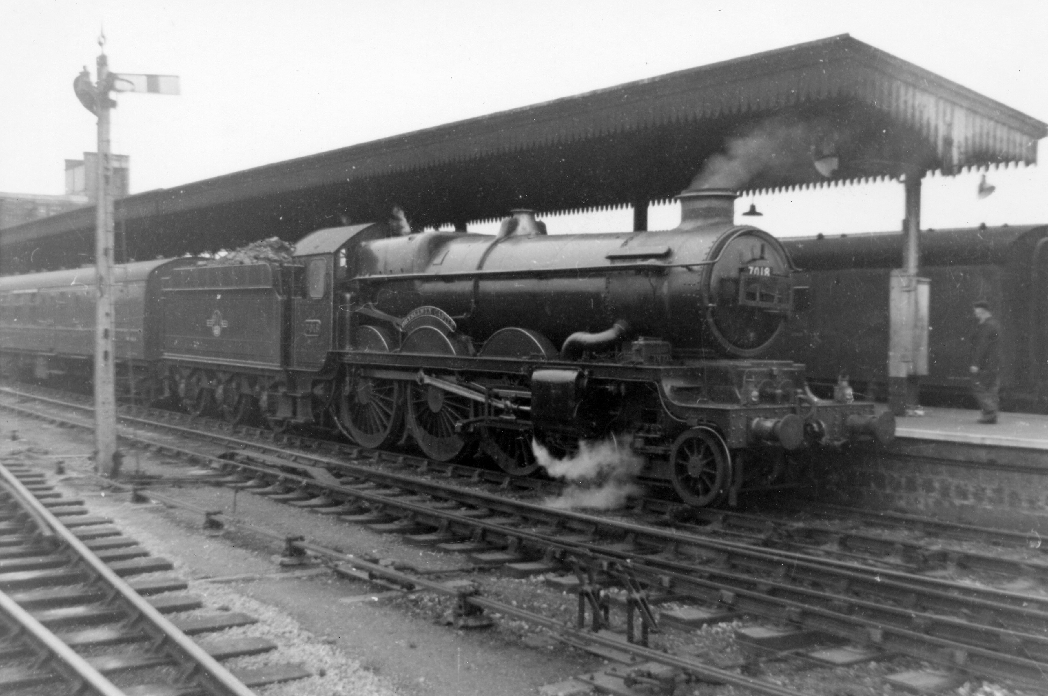 Another Old Oak Common "Castle" (but this time fitted with a single chimney) No.7017 "G.J. Churchward" standing at the south end of Worcester Shrub Hill Station.