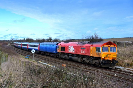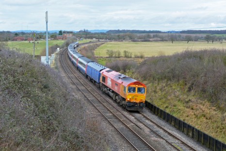 Several photographers struck lucky on their daily exercise on 22nd February 2021, during lockdown No.3, when they were fortunate to see "Biffa" (The Flying Dustbin), class 66 diesel locomotive No.66783 with a train of carriages for scrap. No.66749 was at the rear. Robert Pritchard was at Tibberton whilst Steve Widdowson saw the train at Abbotswood. The train was code No.5Q51 0913 Gascoigne Wood Sidings to Sims at Newport Docks. The scrap