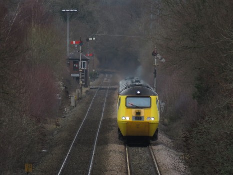 Jack Summerfield's deft use of the telephoto lens produced this dramatic view of the New Measurement Train passing Newland East Signal Box on the February 16th 2021 led by Class 43 diesel locomotive No. 43062