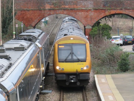 On Sunday 17th January 2021 Jack Summerfield managed to visit Malvern Link during his daily exercise. As it happened fortune worked on his side as he was able to photograph two-car class 170 diesel multiple unit No.170514 in West Midland Trains livery passing IET No.800011.