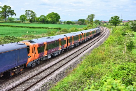 On 4th May 2022 class 37 diesel locomotive No.37800 took three new class 196 diesel multiple units (Nos.196011, 196007 & 196006) from Tyseley to storage at Long Marston. Steve Widdowson photographed the consist at Salwarpe (left) and Droitwich (right).