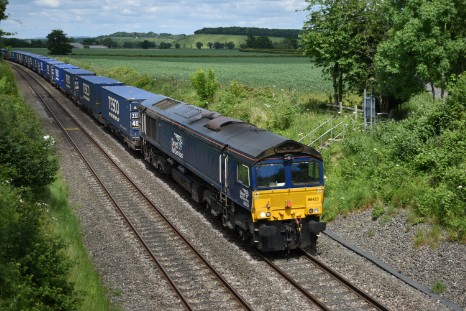 The virtual elimination of daytime freight traffic on the Stoke Works to Abbotswood section of the Birmingham to Gloucester line had become such that by 2022 the only reliable working was the Tesco company container train from Daventry to Wentloog. Andrew Smith photographed it running through Spetchley behind DRS livery class 66 diesel locomotive No.66423 on Saturday 28th May 2022.