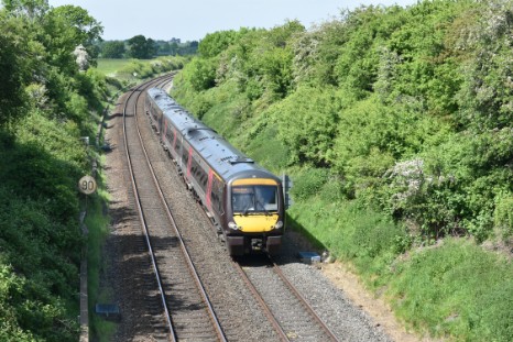 Viewed from Abbotswood Junction overbridge class 170 two-car diesel multiple unit Nos.170112 leads class 170 No.170111 with the 13.07 Nottingham to Cardiff (train code 1V10). Photograph taken by Andrew Smith on Thursday 25th May 2023.