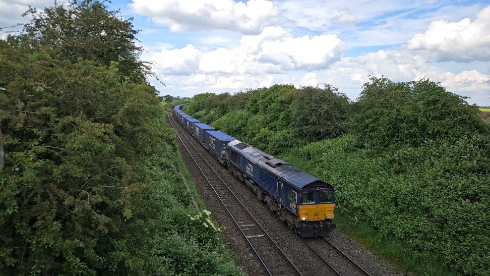 DRS livery class 66 diesel locomotive No.66432 with the 11.55 Daventry to Wentloog Tesco containers train on Saturday 25th May 2024. The train passed Abbotswood Junction just four minutes late at 14.50.