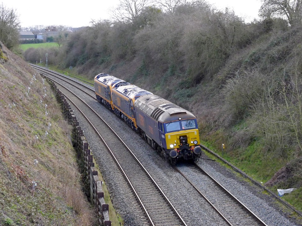There was an unusual working on 25th February 2026 when class 57 diesel locomotive No.57305 was sent to Portbury, Bristol to move two new class 99 locomotives (Nos.99005 and 99006) to Leicester. The consist was photographed by Robert Pritchard at Tibberton.