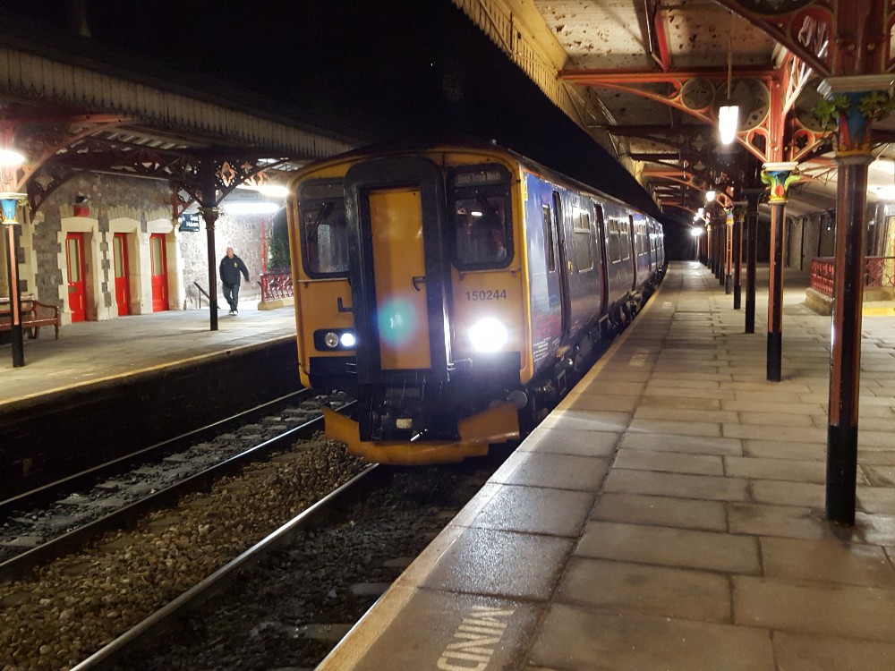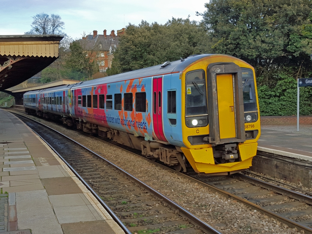 A rare appearance of a weak sun lighlighted the advertising livery on three-car hybrid class 158 diesel multiple unit No.158798 as it put in an appearance far away from the North Somerset business that it was advertising. The class 158 was photographed by Andrew Smith at Great Malvern Station on 8th January 2016 as it ran empty to Malvern Wells (as headcode 5O94) before returning to Great Malvern to work the 14:50 Great Western Railway service (headcode 2O94) to Weymouth. The train had worked to Great Malvern as the 09:22 from Worthing (headcode 1V94) arriving early at 14:29. The reason why it did not start at Brighton as scheduled is not known.