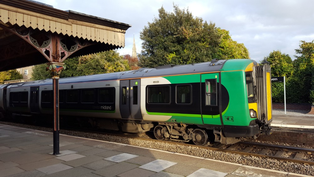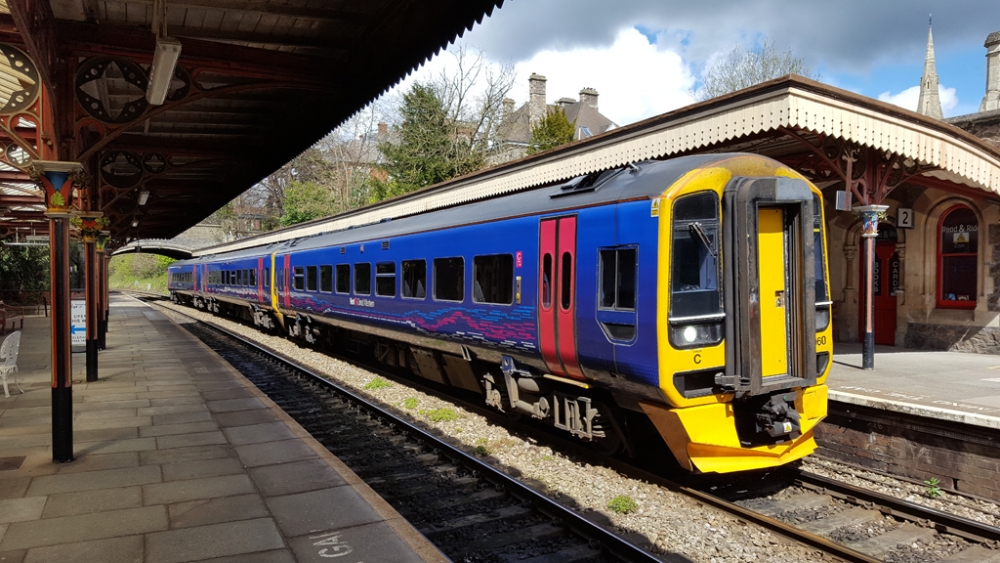 At the end of its lengthy journey of 215 miles from Brighton, class 158 hybrid three-car diesel multiple unit No.158960 in the "Places" livery of Great Western Railways arrived at Great Malvern, on time, at 14:30. The train had left Brighton at 08.59. This train had passed Chichester ten minutes late but there is so much recovery time in the schedule it had little difficulty in regaining right time. Photographed by Andrew Smith, between cloud bursts, on 29th April 2016.