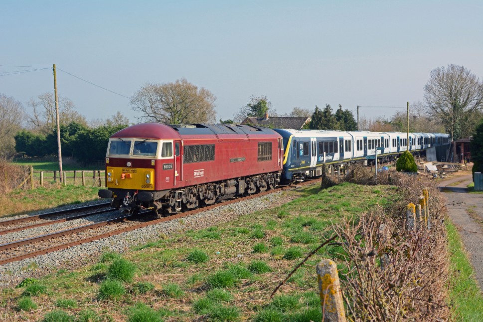 The sun shone brightly on Monday 24th March 2025 which saw one of the regular stock transfers to the Porterbrook site at Long Marston. The train was headed by class 69 diesel locomotive No.69009 "Western Consort" with South Western Railway liveried "Arterio" class 701 Electric Multiple Unit No.701059. The train has started at Eastleigh and Robert Pritchard photographed it as it was approaching Worcester where it reversed to go to Long Marston.