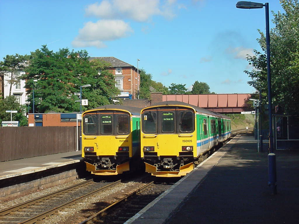 A busy scene as two Centro class 150 diesel multiple units pause at Kidderminster. On the left is three-car No.150109 on the 11:00 from Worcester Foregate Street to Leamington Spa whilst on the right is two-car No.150105 on a train to Worcester. Photograph taken by Andrew Smith on 4th September 2001.