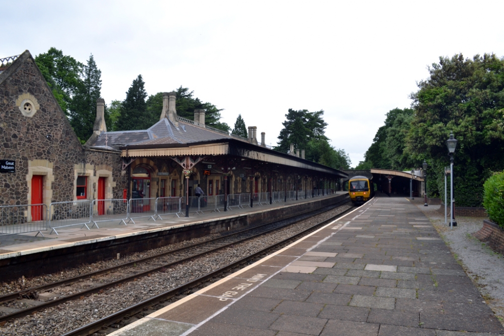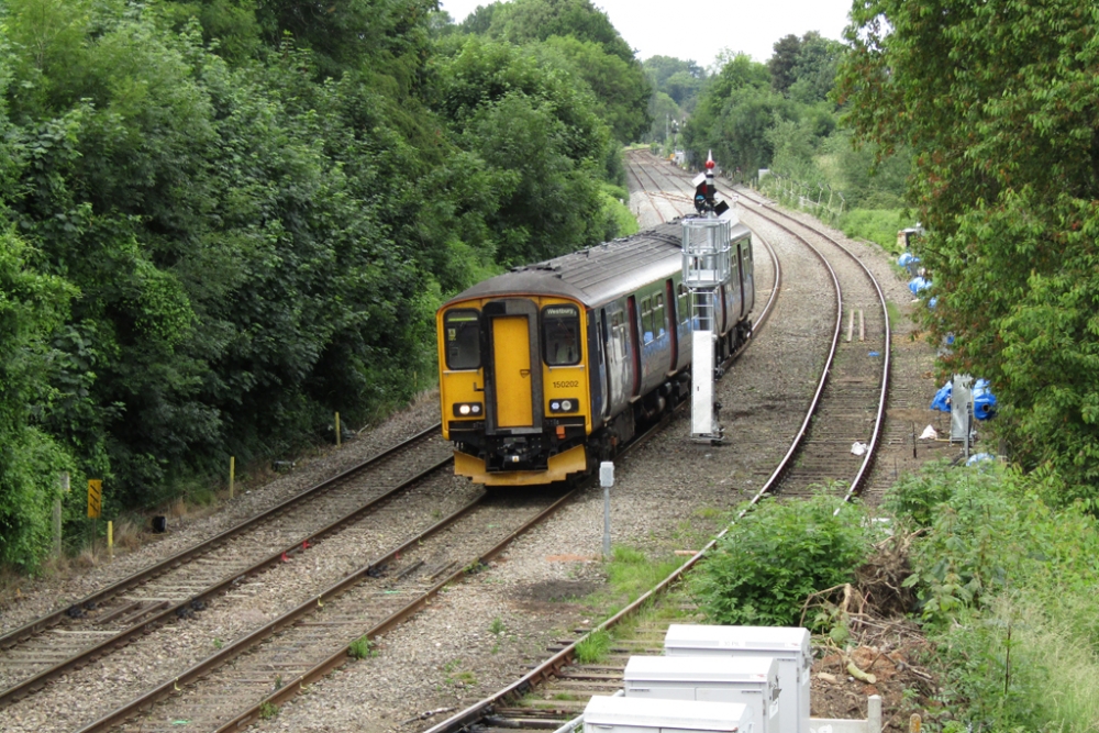 The line reopened on Thursday 22rd June 2016 by which time the old 'down' and 'down loop' semaphore signals had been replaced by those in this photograph of Great Western Railways two-car class 150 diesel multiple unit No.150202 at Malvern Wells with the empty stock from the 12.27 service from Southampton.