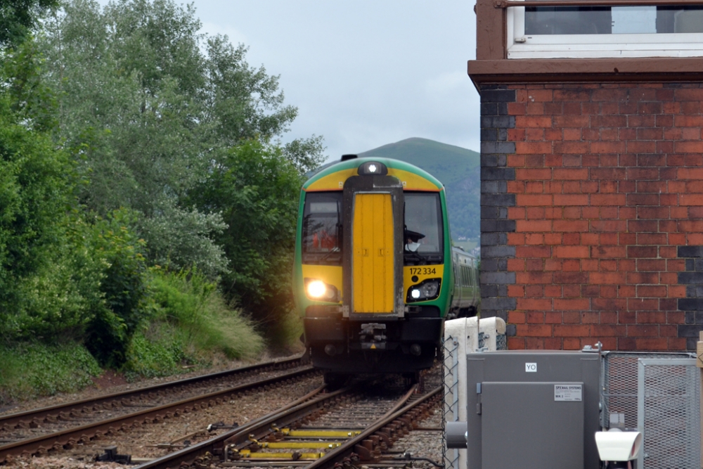 Trains from Great Malvern towards Worcester ran 'wrong line' from Great Malvern Station as far as Newland East Signal Box where the rarely used point crossing was utilised to allow the trains to regain the right track. Pilots were used to assist drivers of trains between Newland and Great Malvern, and trains stopped across Stocks Lane to allow them to alight from the train cabs. Three-car London Midland Trains diesel multiple unit No.172334 was in charge of the 10.46 from Great Malvern to Dorridge on Saturday 18th June 2016 (train code No.2C30).