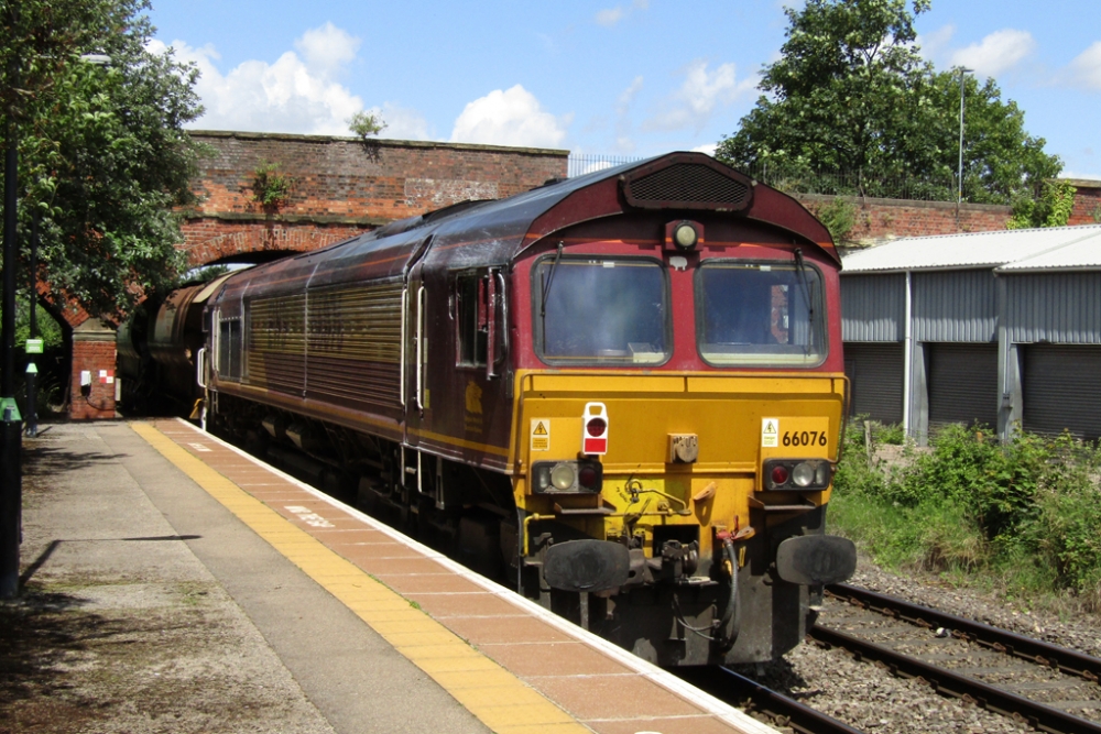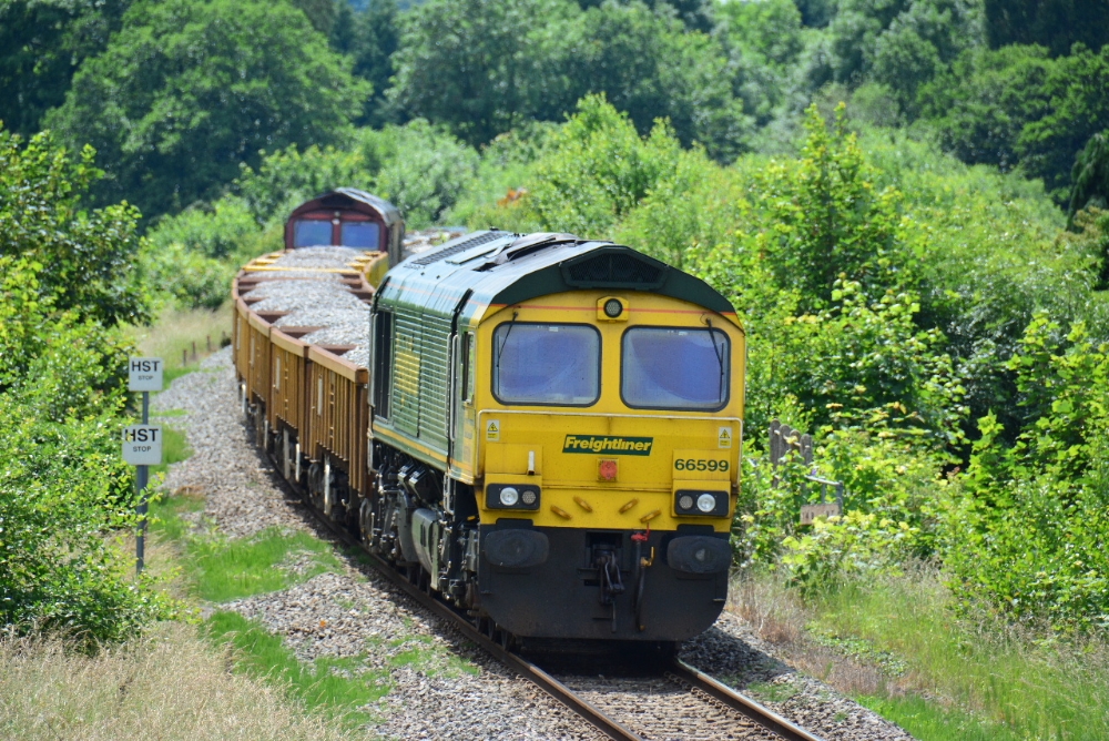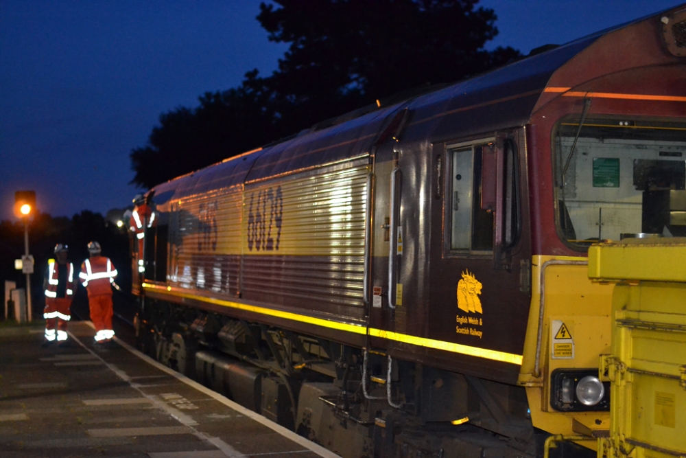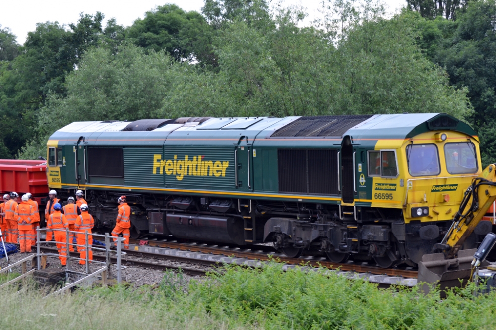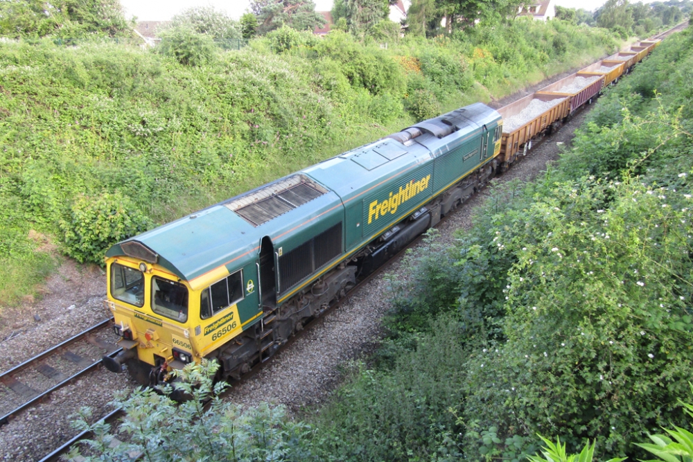The next train arrived early on Sunday morning with new ballast from Hinksey Sidings and was headed by Freightliner livery class 66 diesel locomotive No.66595. It is seen at Malvern Wells.