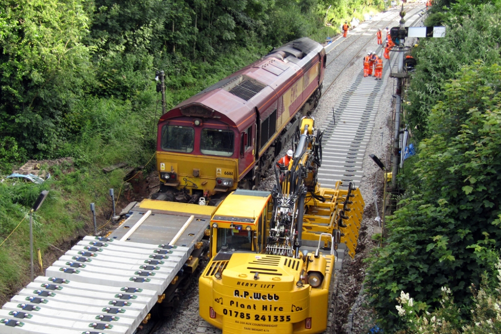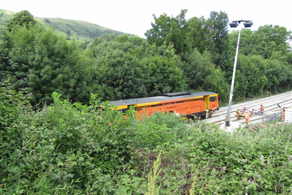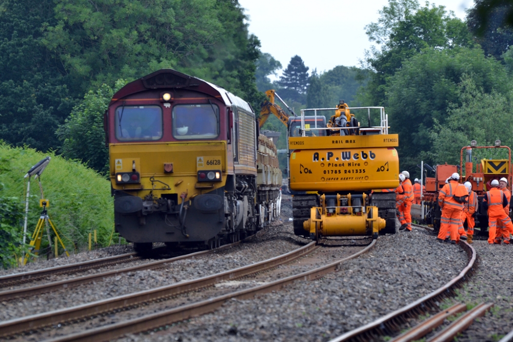 After the departure of No.66128 a train of track panels was moved into its place on the 'up' main. This photograph shows class 66 diesel locomotive No.66092 with several items of on-track plant in use.