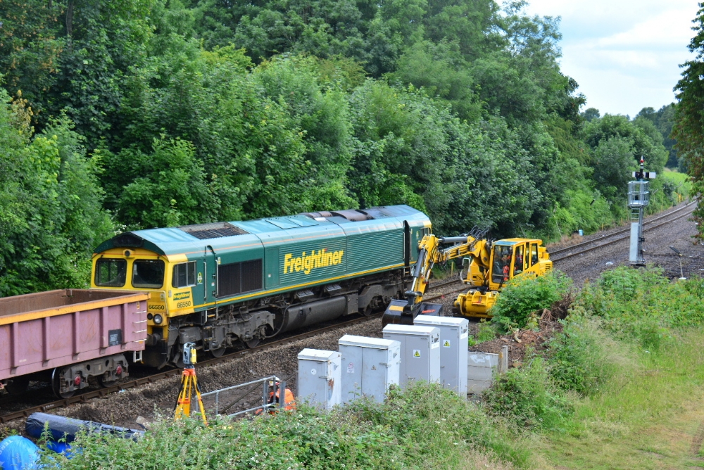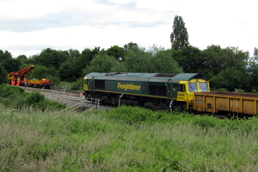 The final photograph from the Saturday/Sunday 25th/26th June 2016 possession shows Freightliner class 66 diesel locomotive No.66524 loaded with spent ballast'on the 'up' main line with a Colas Railcrane in the 'down' loop.