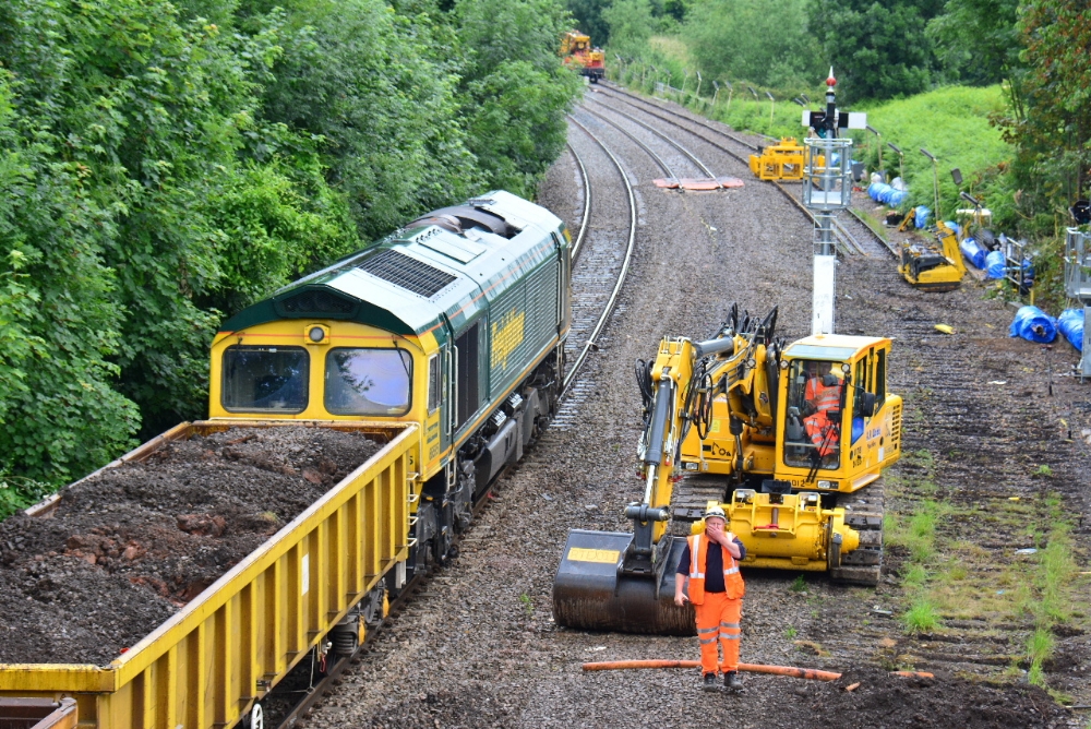 The line was taken over by the engineering department after the end of services on Friday and eight more trains arrived with wagons, ballast and rails to allow the whole of the 'down' main track from the site of the new crossover to Malvern Wells Signal Box to be relaid. These trains were hauled by a mixture of Freightliner and DB Cargo class 66 diesel locomotives: Nos. 66951, 66595, 66550, 66525, 66599, 66076, 66115, 66205 and 66176. The photographs below were taken by Steve Widdowson on Saturday 25th June 2016.