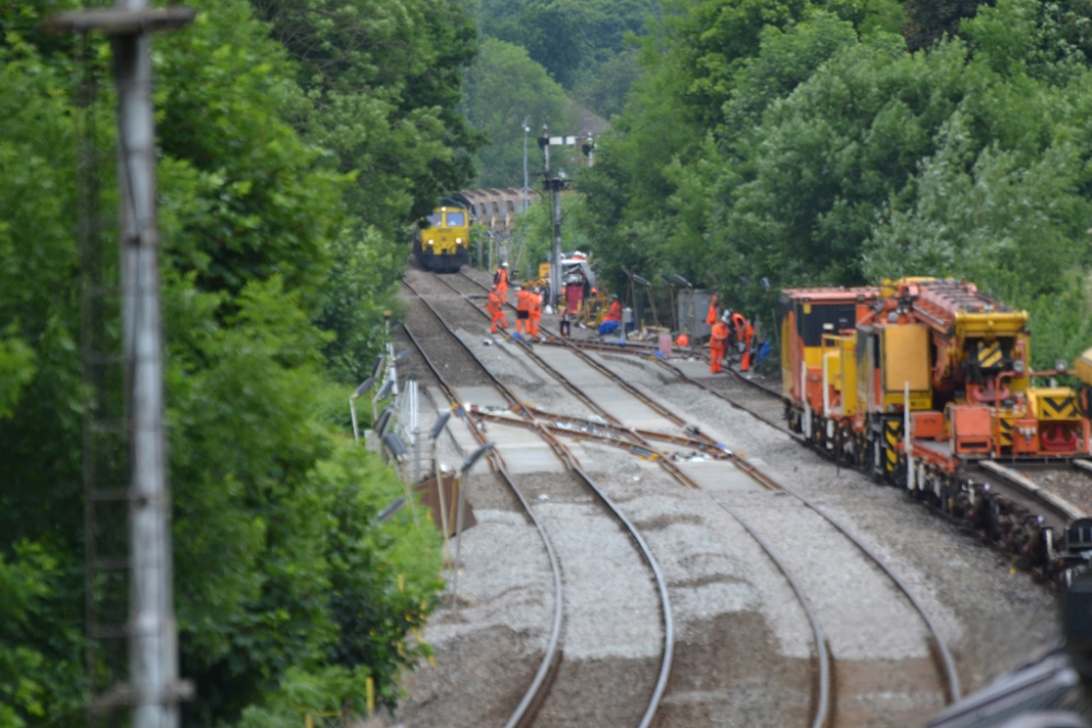 This photograph shows the result of all the activity over the weekend of 18th and 19th June 2016 with the insertion of a new crossing in the foreground and furthest away from the camera can be seen the renewal of the crossing into the 'down' loop line. The locomotive on the 'down' line is Freightliner No.66536 (with sister locomotive No.66524 out of sight round the corner) which had arrived on Sunday with a train of new ballast.