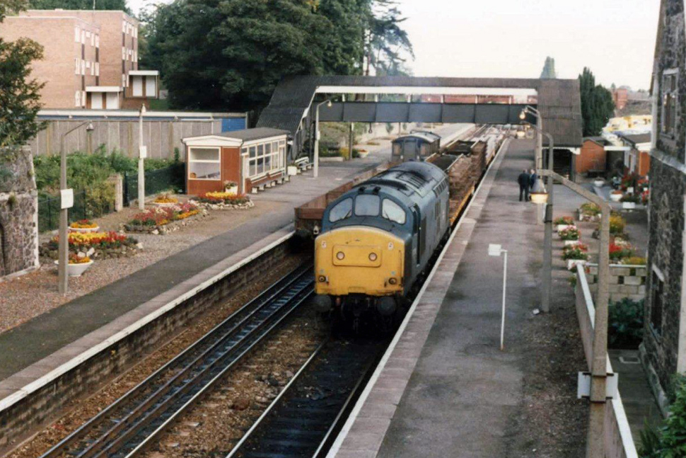Blue livery class 37 diesel locomotive No.37285 photographed in 1985 whilst in use on Sunday engineering duties. Note the neatly kept flowers beds on both platforms. This photograph was taken from Worcester Road bridge which was built in 1913 to replace an earlier structure. Photograph taken by Richard Atkinson.