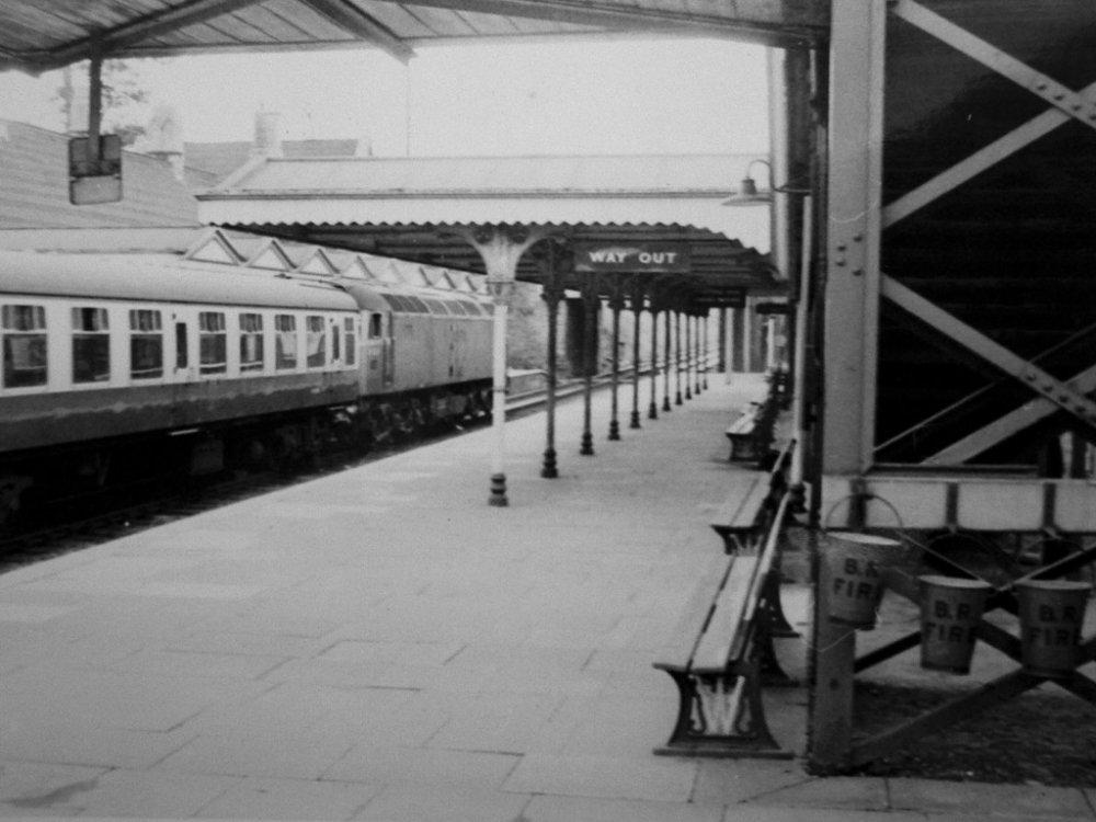 An unidentified class 47 diesel locomotive at the head of a 'down' train to Hereford. The 'BR Fire' buckets look rather inadequate should there be a fire but they were a feature of most railway stations. Some of the GWR type seats survived the demolition of the station but not the station awning and all of the 'up' side buildings which were demolished by British Railways and replaced by utilitarian style waiting rooms. The photograph was taken by Robert Cooke.