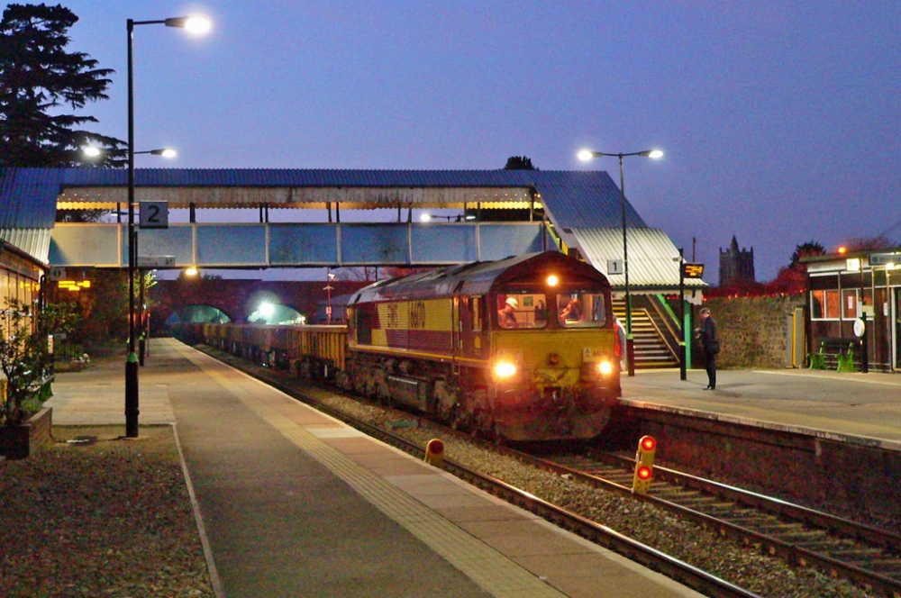 Class 66 diesel locomotive No.66170 in the livery of former owner EWS pauses at Malvern Link with the Bescot to Westbury (train code No.6W03) ballast train. The first wagon is Network Rail owned JNA NLU 90 tonne open box wagon No. 29135. The train had earlier been used to carry the new ballast for a track renewal project at Newland. Photograph taken by Robert Cooke on 1st April 2012.
