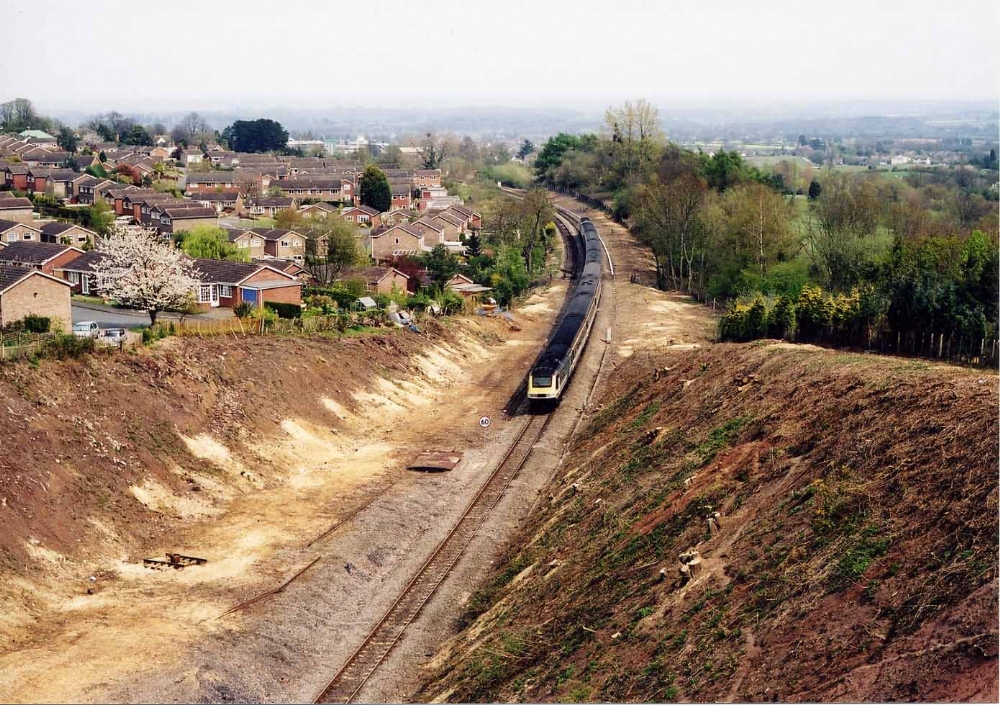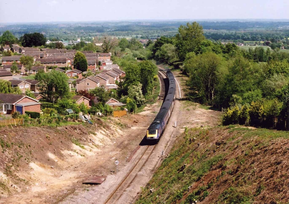At the same spot as the above photograph is First Great Western HST car No.43027 leading No.43124 on the final part of the climb from Malvern Wells on 4th May 2003. Photograph taken by Robert Pritchard.