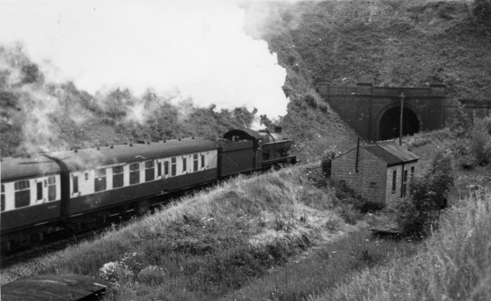 Photographs of trains entering the tunnel through the Malvern Hills are quite rare but Tim Farebrother was able, in the early 1960s, to make this fine study of an ex-GWR "Castle" class 4-6-0 steam locomotive approaching the tunnel with the 'down' "Cathedrals Express . The area on the right hand side of the photograph is the approach to the original tunnel which was built by the Worcester and Hereford Railway.