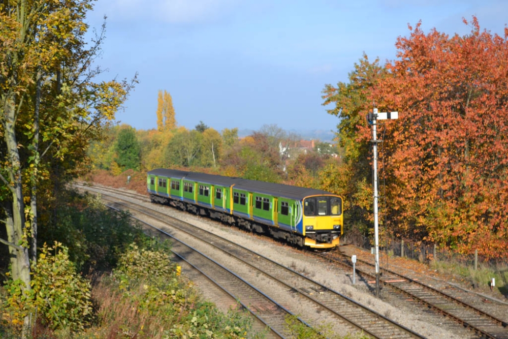 On a sunny autumn day the late afternoon sun casts a long shadow off the signal in front of Network West Midlands livery class 150 3-car diesel multiple unit No.150015. The train is in the 'down' refuge loop which is used to stable stock from trains that terminate at Great Malvern.