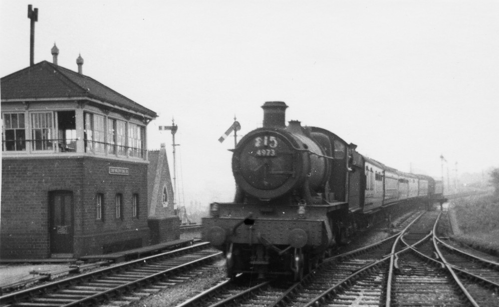 This Tim Farebrother photograph, which dates from about 1960, shows ex-GWR "Hall" class 4-6-0 steam locomotive No.4973 "Sweeney Hall" of Hereford shed approaching Great Malvern Station with a 'up' train possibly bound for Birmingham Snow Hill. The photographer was standing at the south end of the station with Great Malvern Signal Box on the left hand side. This is a view looking towards Malvern Wells. The first road to pass under the railway as it heads south towards Malvern Wells is Clarence Road but photography has never been possible at tha spot.