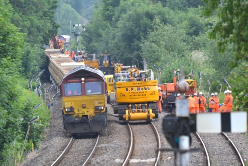 In the summer of 2016 the long-disused area came into use again as a compound for a major track renewal programme at Malvern Wells. An access point was cut into the trackside fencing to allow on track plant access to the main line from the compound. Numerous engineering trains were run in conjunction with these works and two can be seen in the above photographs.