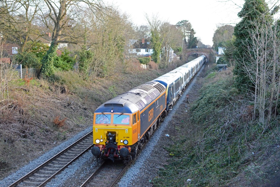 Class 57 diesel locomotive No.57306 towing No.701023 with the 14.40 from Long Marston to Wimbledon Park depot via a reverse at Worcester. From a viewpoint in Perry Wood Walk (also known as the Metal Box bridge), Robert Pritchard took this lovely photograph on Wednesday 28th January 2026.