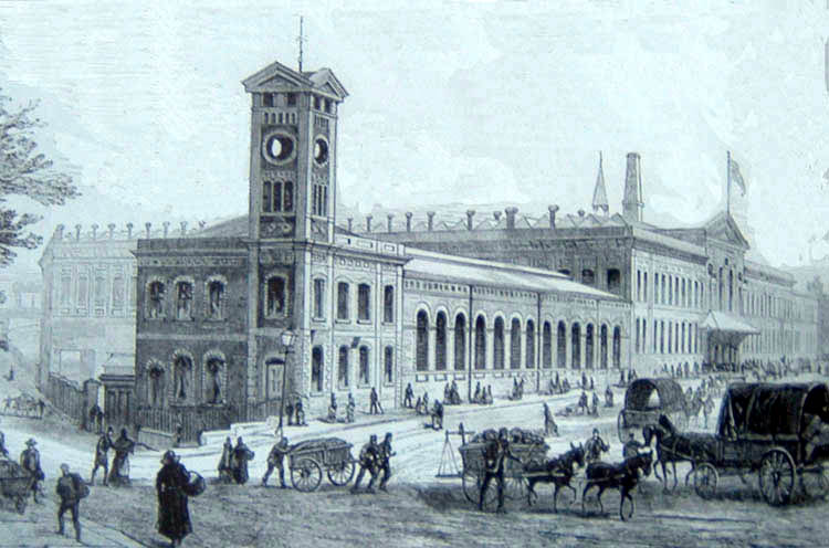 This is an engraving of the exhibition (collection of Andrew Smith). Tolladine Road is on the left hand side. It is worth noting that there is no sign of the siding that went across Tolladine Road into Gas Works, although the course of the siding can be traced through the hole in the left most building and the gap in the wall.
