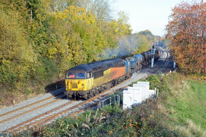 The 2016 Rail Head Treatment Train season was handled in the county by a pair of filthy Colas livery class 56s (Nos.56078 and 56301). Not even the late autumn sun could penetrate the dirt as the train passed Malvern Wells on 2nd November 2016. Photograph taken by Robert Pritchard.