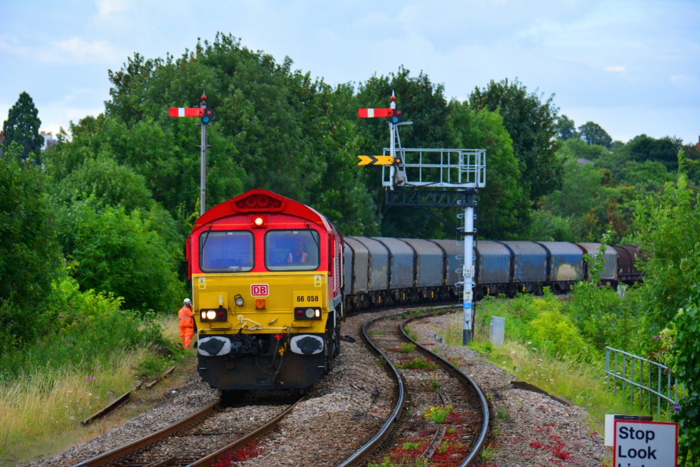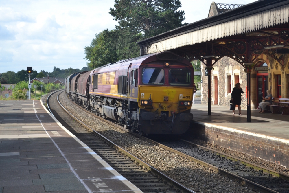Between Monday 8th August 2016 and Wednesday 10th August the Margam to Round Oak loaded steel train and afternoon returning empties were diverted via Malvern and Hereford - a line which does not normally see any freight trains at all. The trains was operated by DB Cargo using class 66 diesel locomotives: No.66126 on Monday, No.66058 on Tuesday and No.66082 on Wednesday. No.66082 was photographed by Steve Widdowson (above) and Owen Morris (below). The photograph of No.66058 was taken by Steve Widdowson and No.66082 by Andrew Smith.