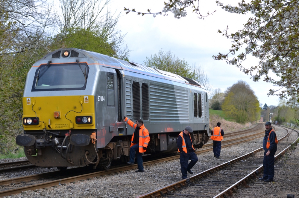 In preparation for a planned resumption of freight train working between Hereford and Worcester, class 67 diesel locomotive No.67014 is seen at Malvern Wells whilst training crews from Bescot. The class 67 worked two trips per day and this is the first, seen at Malvern Wells, on Tuesday 26th April 2016. Photograph taken by Andrew Smith.