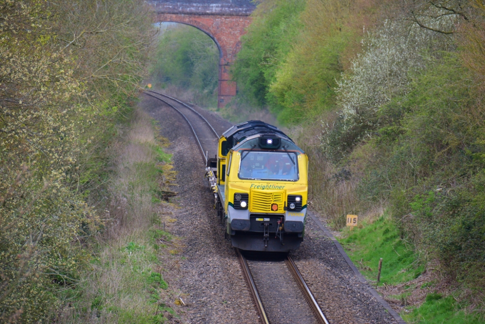On 21st April 2016 Freightliner livery Class 70 diesel locomotive No.70006 ran from Long Marston to Southhampton via Worcester yard where it ran round its 2 wagon flats, then back down the Cotswold line to Oxford and on to Southampton. This was the first time a Freightliner class 70 had run over the Cotswold line as previously only Colas 70ss have worked over this line. Photogrpah taken by Steve Widdowson at Stoulton, near Pershore.