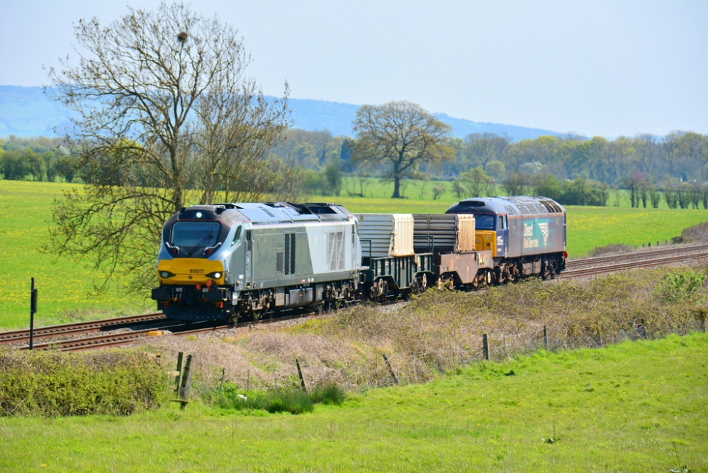 On Thursday 5th May 2016 the Bridgwater to Crewe nuclear flask train saw its first use of class 68 diesel locomotive when the train (train code 6M63) consisting of two flasks was hauled by No.68011, accompanied by class 57 diesel locomotive No.57003. Photographed at Abbotswood by Steve Widdowson.